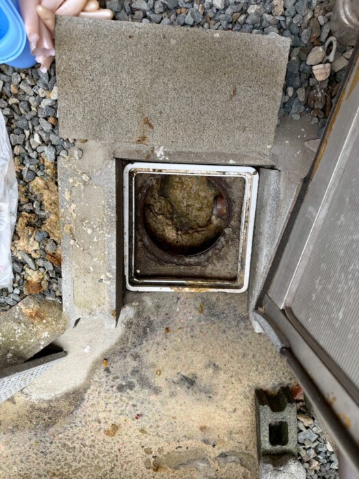今回の工事では、業務用の高圧洗浄機を使用して排水マスと排水管内部の汚れを徹底的に除去しました。